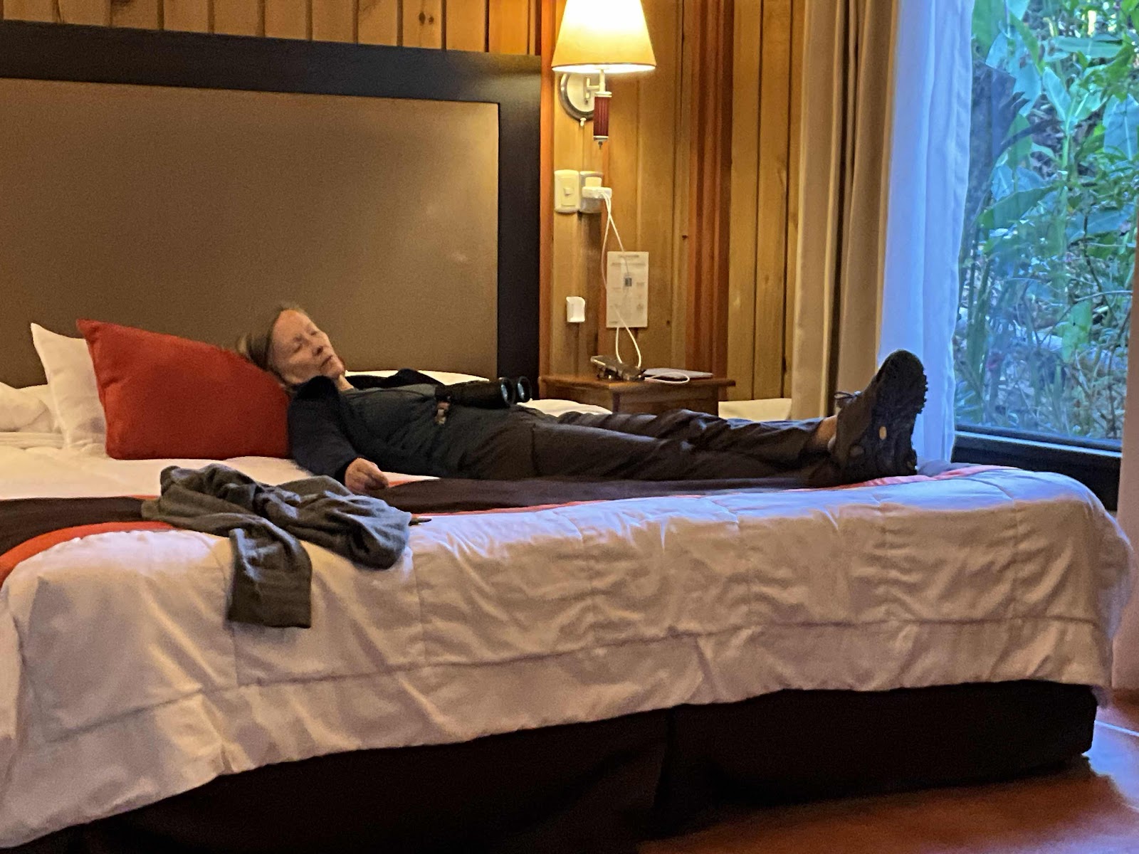 Could this photo be representative of one of the reasons I’m not blogging that much ๐๐๐. Mike took this of me yesterday afternoon probably about three pm. We are extremely amused by the fact I fell asleep wearing my binoculars and shoes! Additionally, this type of lodge is not a place that has evening turn down service where they remove the extra pillows and the bed scarf/runner from the foot of the bed. So while we have enjoyed our time here, I have made a few commentaries to Mike about how ridiculous some things seem; for instance this bed runner that I have to remove nightly, and I keep saying why would they bother.