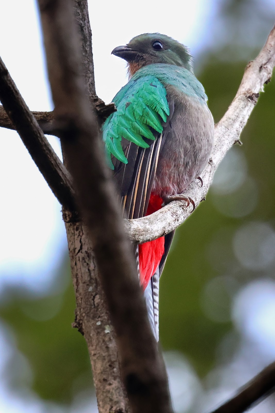 We got better views of both the male and female quetzal today. We went out without a guide today but went to the same tree we saw them in yesterday. We were the only ones there when Mike saw one fly in and then Chris found them both. The light wasn’t great. They crossed the road and were a bit more out in the open. Then, a tour bus drove by, saw us photographing, stopped and motioned to Chris to ask if quetzals were nearby. She nodded yes, and 20 people and three guides got out. Soon, the quetzals flew down the road a bit and fortunately one of the guides found them and motioned to us and the group to a better spot.